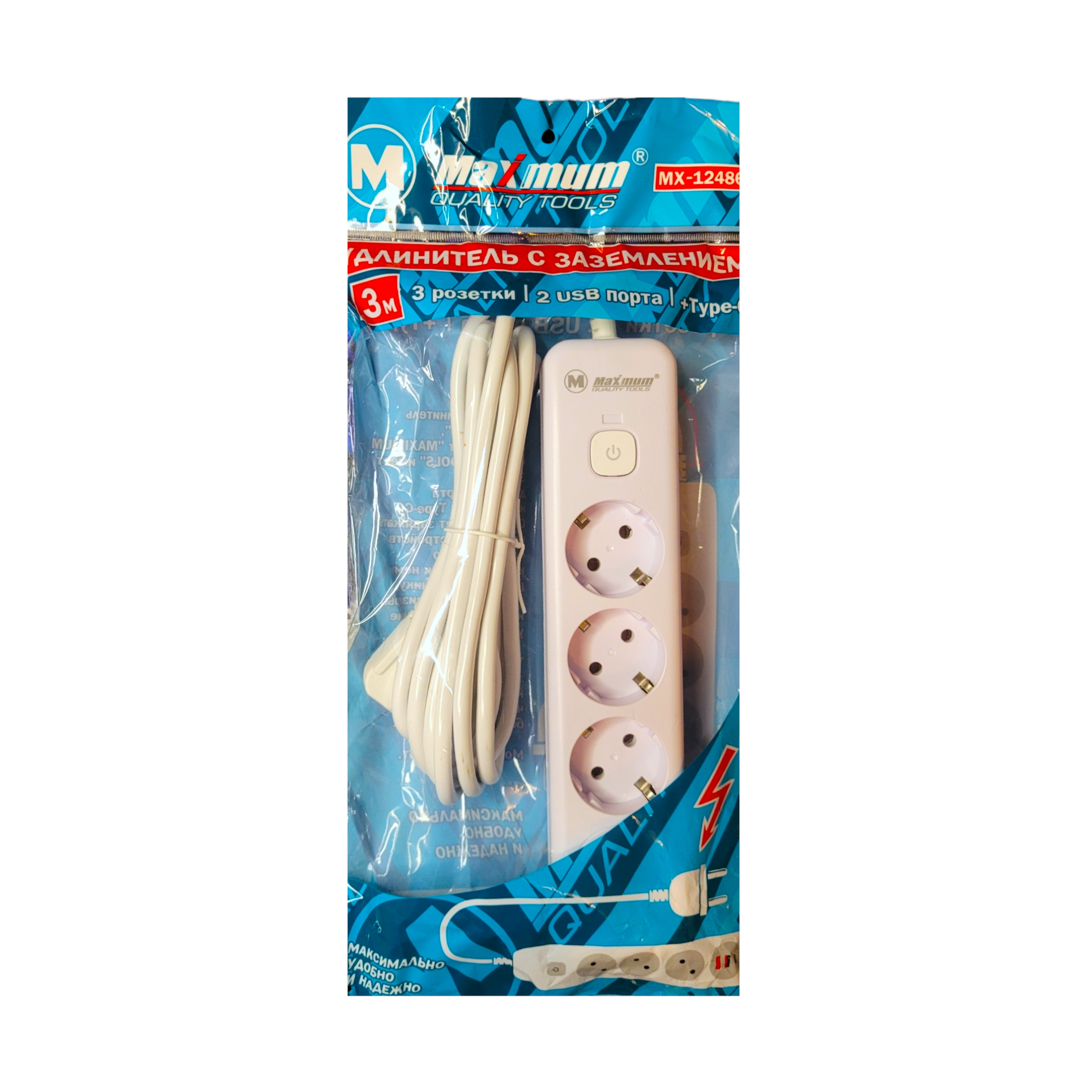 Удлинитель сетевой белый с безпроводной зарядкой 3 метра, 3 евро розетки, 4 USB порта, Type C, 2500W