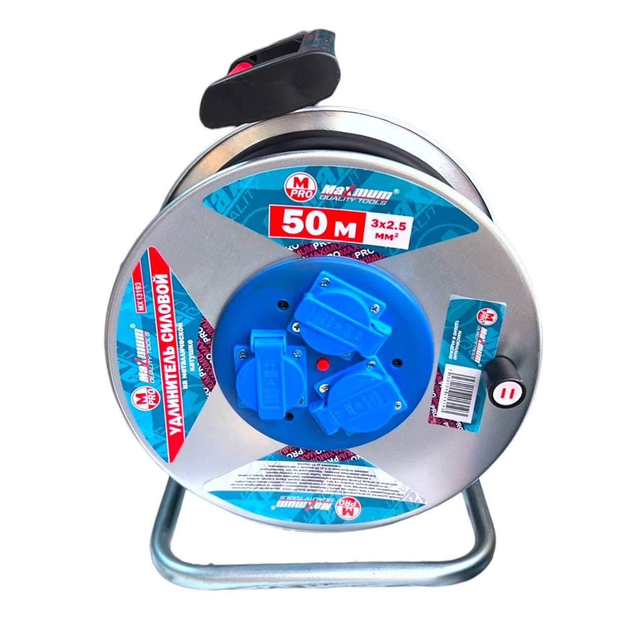 Удлинитель на противоударной лёгкой алюминиевой катушке с кабелем КГ сечением 3х2,5 мм² от "Maximum Quality Tools" оборудован одной выносной EURO розеткой. Силовой улинитель на 220 Вольт с длиной кабеля 50 метров используется для временного подключения удаленных объектов на стройке и дачном участке. Длина удлинителя 50 метров, он выполнен на прочной алюминиевой катушке с металлической усиленной стойкой. Может использоваться при температуре от -40°С до +40°С. Удобные пластиковые заглушки на розетках предотвращают попадание влаги. Пластиковая рукоятка создана для быстрой смотки и транспортировки. Профессиональная система Twist System не позволяет кабелю спутываться. Удлинитель оборудован защитой от перегрузок.