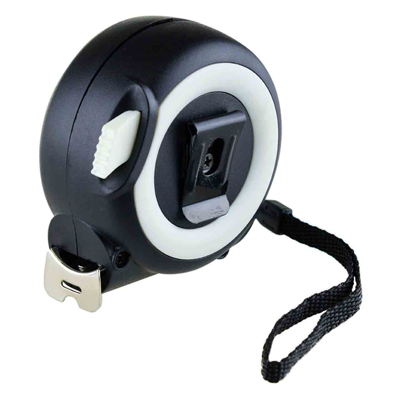 Измерительная рулетка имеет ремешок для ношения на запястье и металлическую клипсу для крепления на сумке или поясе.