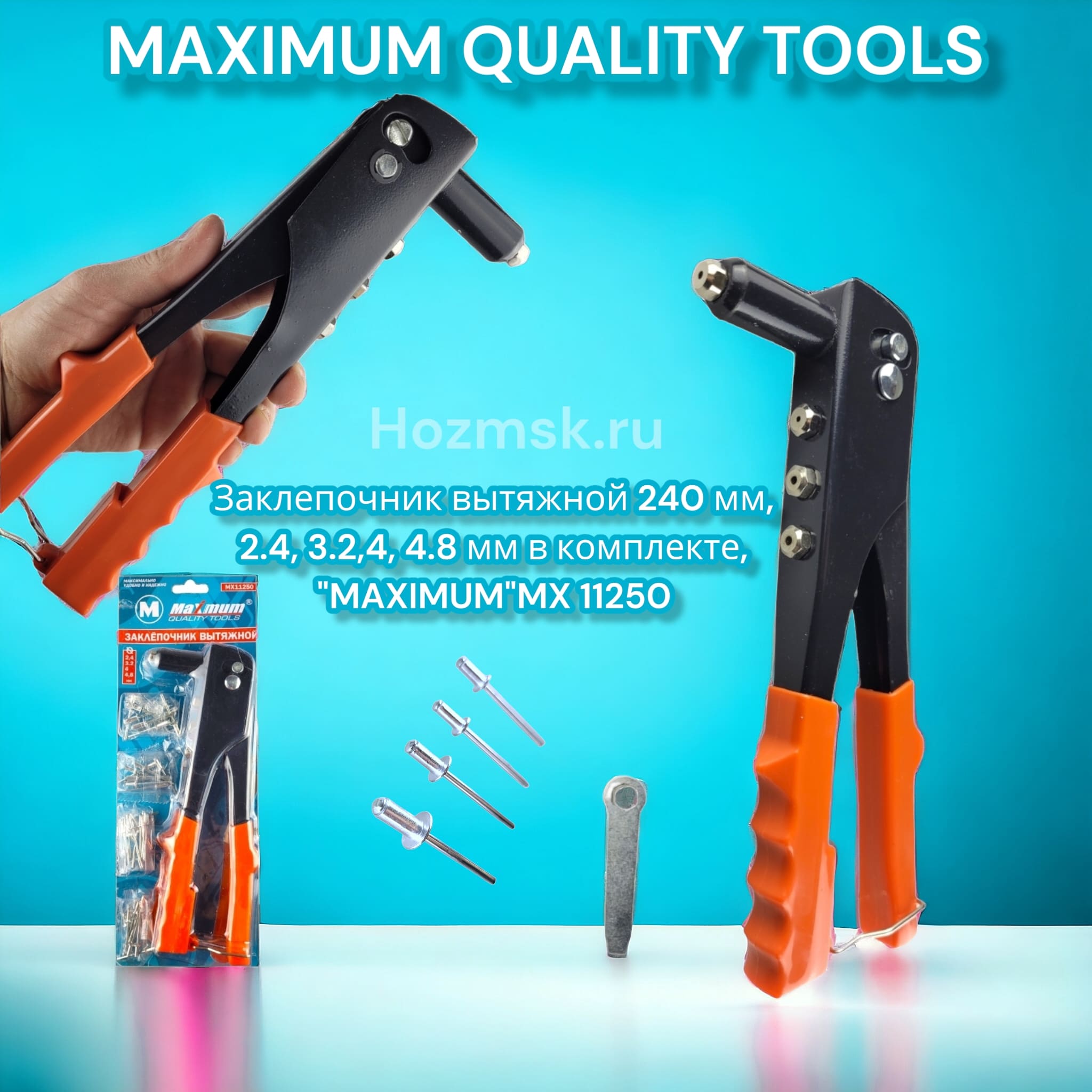 Заклепочник вытяжной 240 мм, 2.4, 3.2,4, 4.8 мм в комплекте, "MAXIMUM"MX 11250