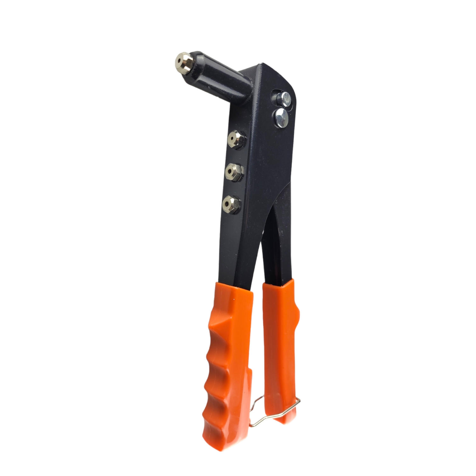 Стальной заклепочник имеет сменные 4 насадки для заклепок различных диаметров и ключ для их замены, который убирается в рукоятку.