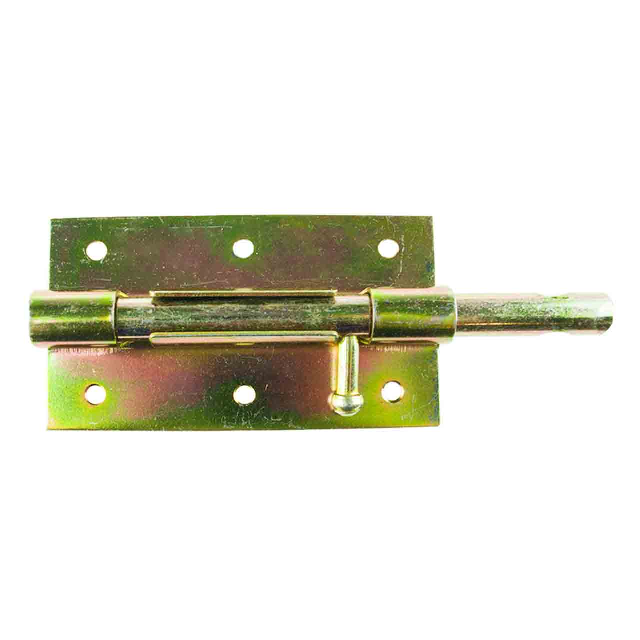 Накладной шпингалет - считается самой простой и в то же время надёжной конструкцией. Шпингалет из стали покрытый желтым цинком 65x120 мм предназначен для фиксации створок дверей в закрытом положении. Круглая ручка, зафиксированная в закрытом положении надежно препятствует случайному открытию: ход ригеля 50 мм. Число отверстий для шурупов 6.
